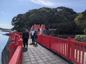 その後、照島神社がある照島へ到着。照島神社へ向かうには朱色の太鼓橋を渡ります。